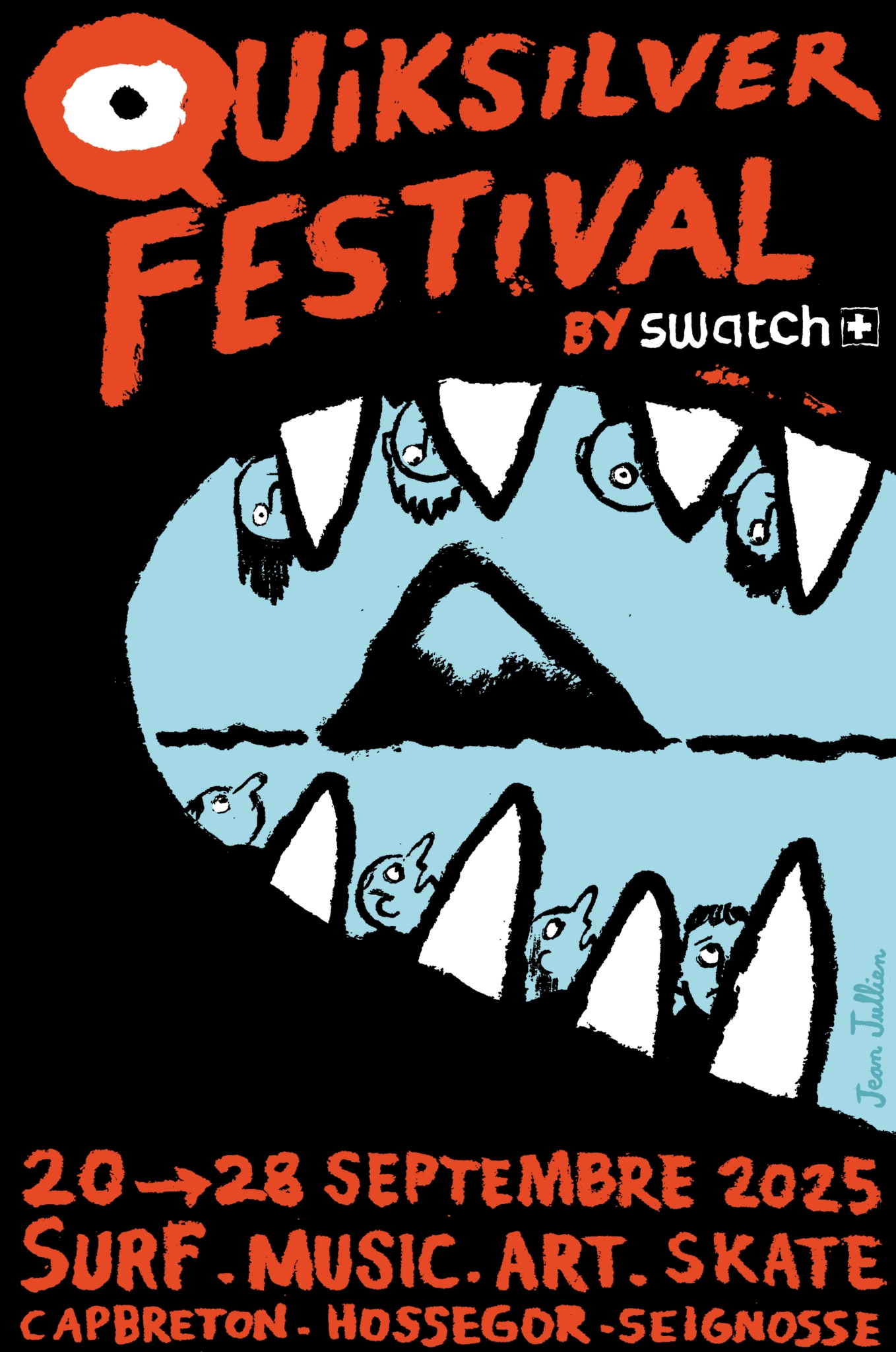 À propos de cette collaboration, Jean Jullien confie : « J’ai grandi avec le surf shop Nova Fun de mon oncle et ma tante, et Quiksilver faisait partie intégrante de la culture graphique qui m’émerveillait alors. Je suis content de pouvoir prêter ma patte au Quiksilver Festival et par se faire, rejoindre le line up d’artistes ayant joué avec l’iconographie culte de la vague mangeuse. »