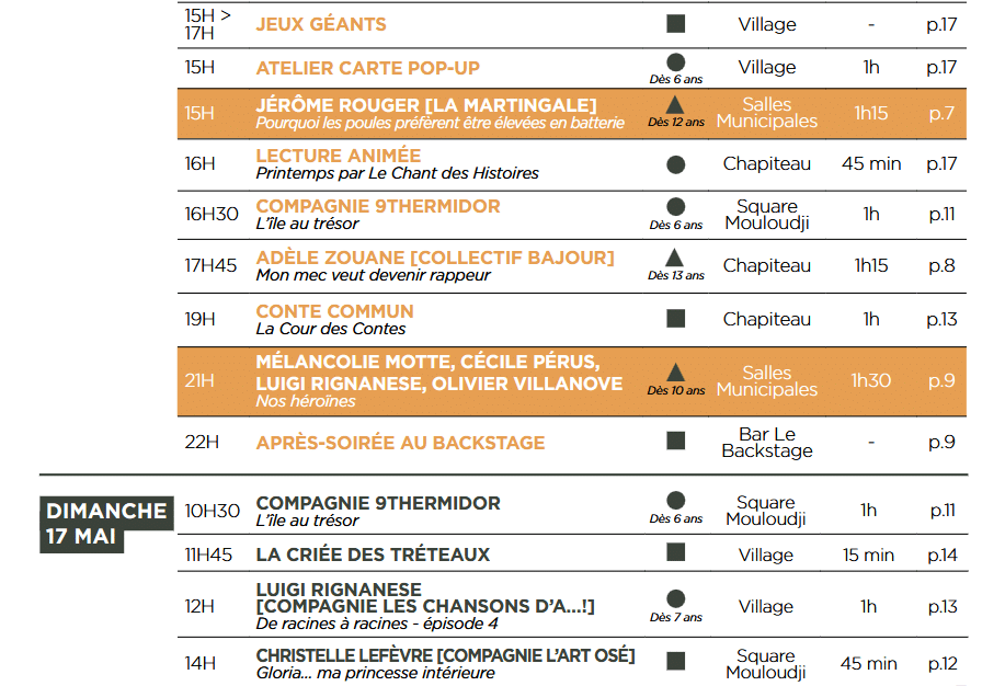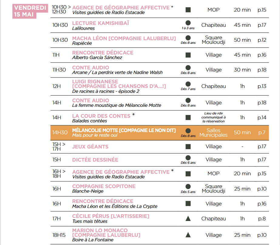 Les Salles municipales accueilleront les grands spectacles, tandis que le Village du festival offrira animations et temps forts en journée, en lien avec la médiathèque-ludothèque L’Écume des jours et les partenaires culturels de la Ville.